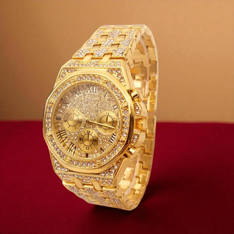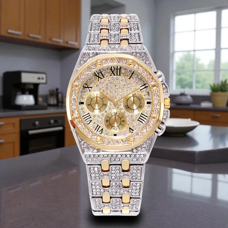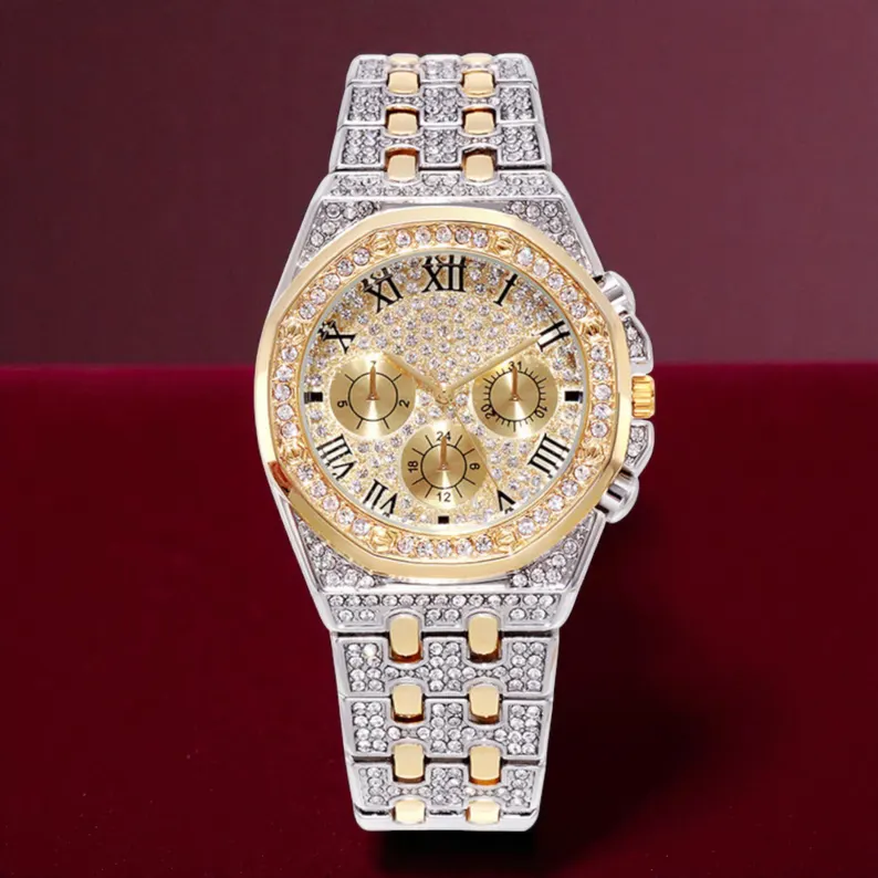 Gold Iced Out Luxury Watch for Men, Diamond Sparkle Roman Numeral Dress Timepiece with Multi Dial Design