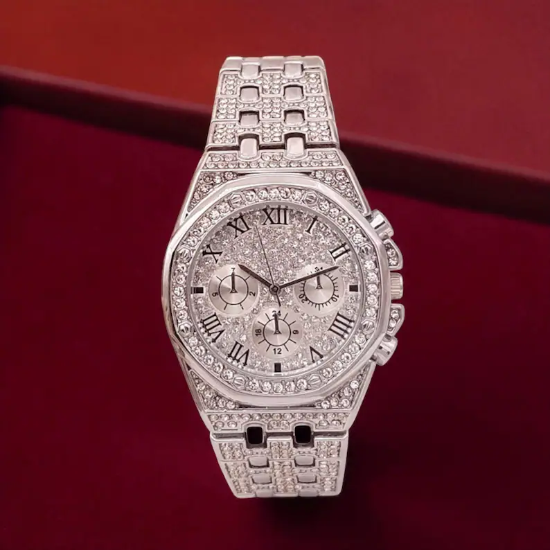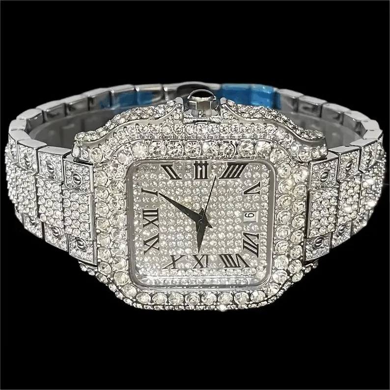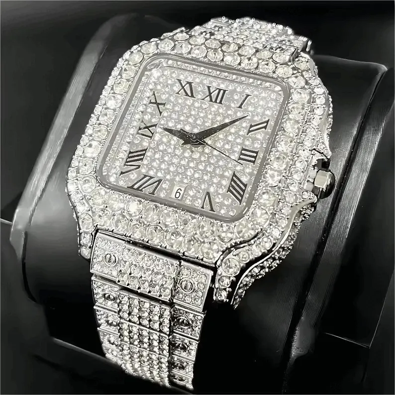 Iced Out Luxury Watch for Men, Diamond Sparkle Roman Numeral Dress Timepiece